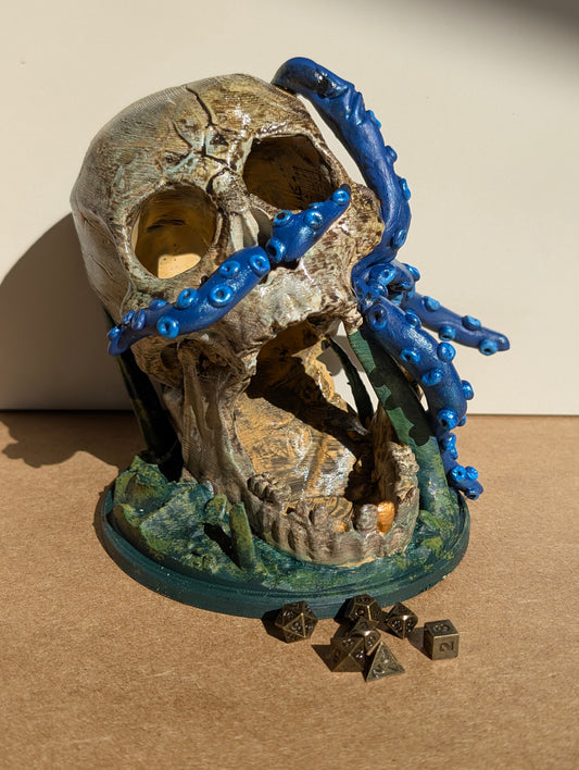 TTRPG accessories, miniature dice tower, skull with tentacles. gift ideas for geeks & gamers