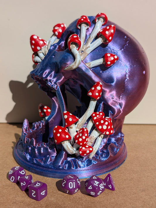 TTRPG accessories, miniature dice tower, skull in nature with shrooms. gift ideas for geeks & gamers