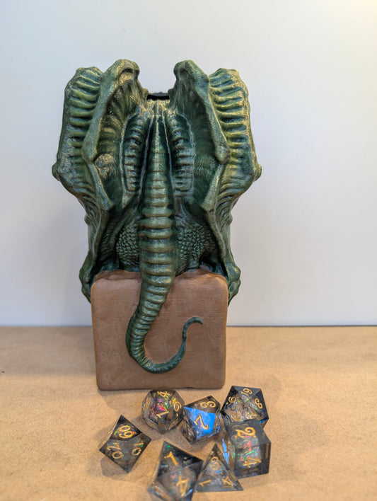 TTRPG accessories, Cthulhu dice tower with deep sea shimmer dice gift ideas for geeks & gamers