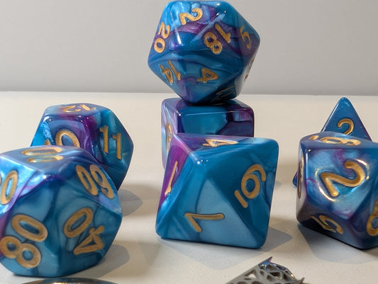 wishful dreams sparkly foil tabletop roleplay gaming polyhedral dice gift set, badeg, keyring.
