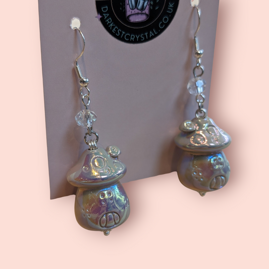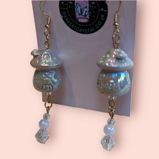 Whimsical Pearlescent Ceramic Mushroom Fairy House Dangle Earrings with Glass Bead Accents