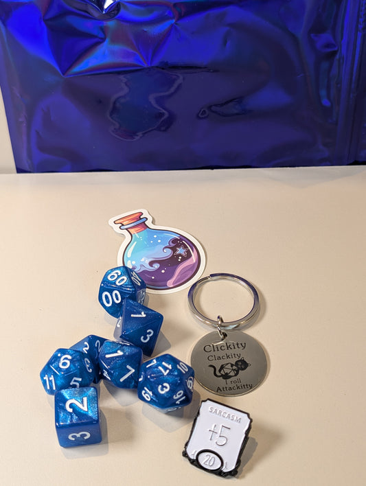 Blue Dice Pack – Polyhedral Dice Set with Sticker, Keyring, and Badge!