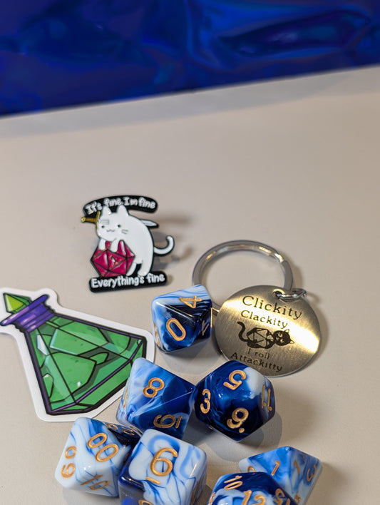 Blue & white Dice Pack – Polyhedral Dice Set with Sticker, Keyring, and Badge!