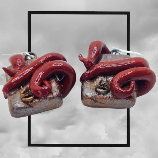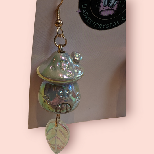 Whimsical Pearlescent Ceramic Mushroom Fairy House Dangle Earrings with Glass Bead Accents